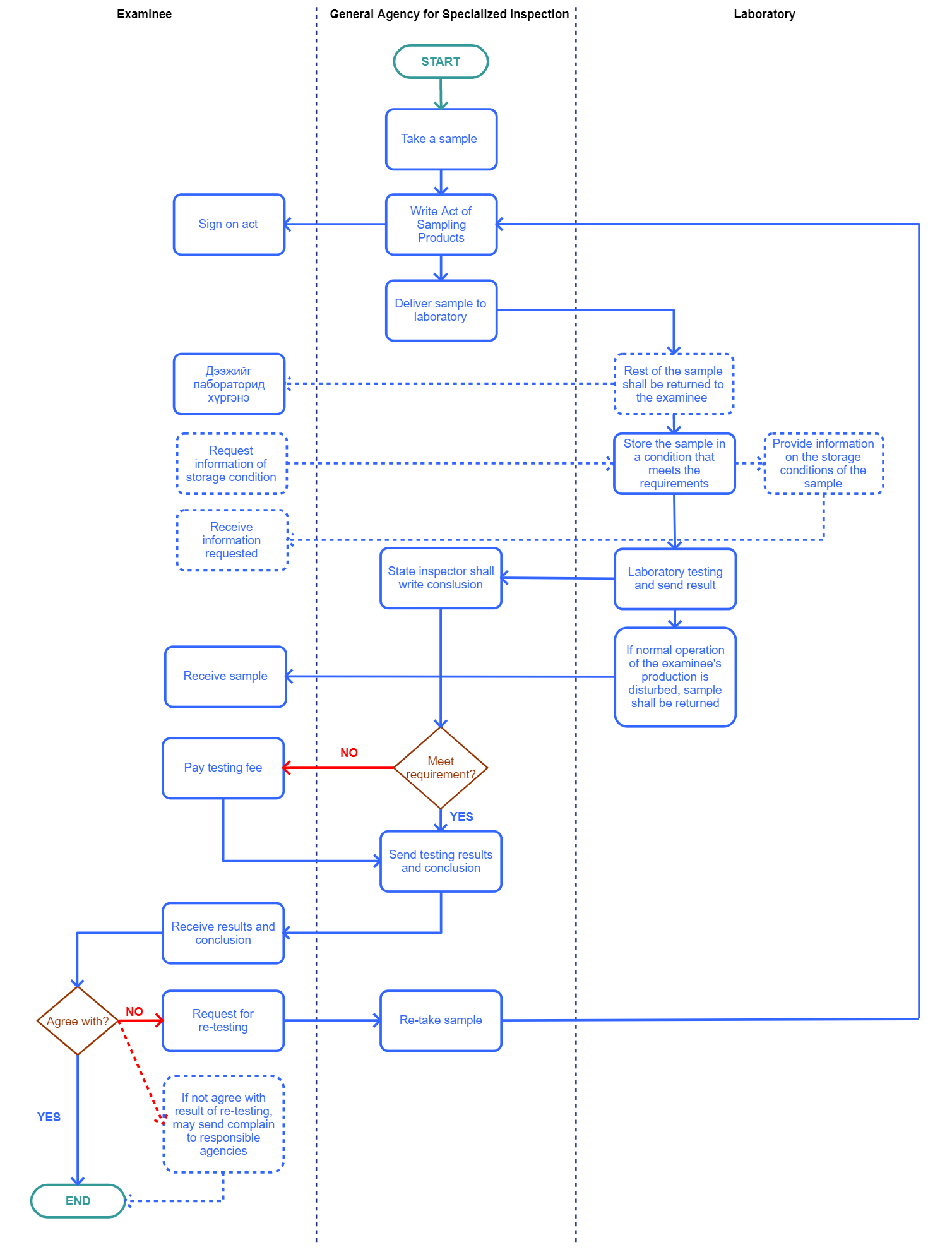 | Procedure for sampling, storage and transportation of products | Inspection Requirement | | The purpose of this procedure is to regulate the relations between the specialized inspection agency and the inspected entity on taking samples of products, their storage, transportation, payment of samples and payment of test fees during the inspection. | - Samples may be taken by scheduled inspections and applications, requests, complaints, information and decisions of authorized organizations by citizens, business entities and organizations.