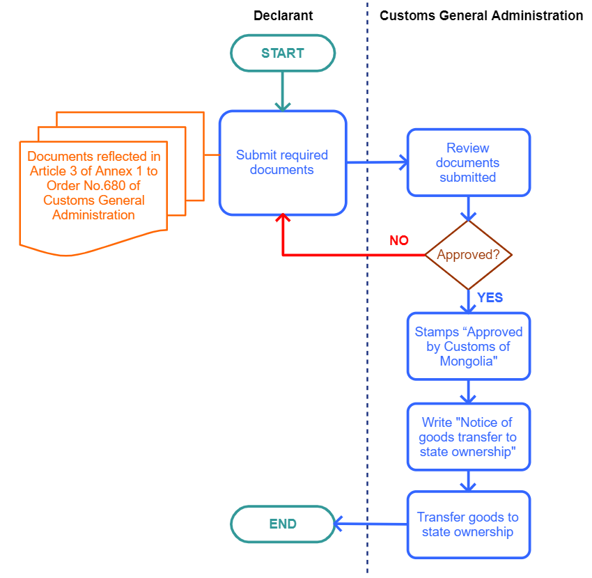 | Customs clearance procedure for refusal to accept goods | General | | According to the Article 202-207 of the Customs Law, goods refused to receive shall be declared under this customs clearance procedure approved by Annex 1 to the Order No. 680 of 2008 of the Chairman of the Customs General Administration. The goods placed under the procedure shall be transferred to the state ownership by writing “Transfer sheet to the state revenue” | This measure applies to one of the customs clearance regime. Therefore, may apply to large number of commodities classified under the Harmonized Commodity Identification and Coding System. Thus it has not been linked with any commodities. Thus it has not been linked with any commodities. | Customs clearance procedure for refusal to receive goods, goods destruction and goods of international transportation service | 31-12-9999 | Good |