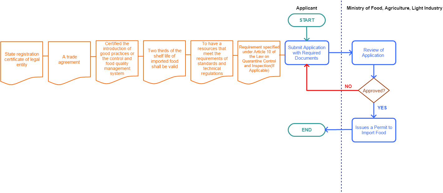 | Export and Import Permit requirement for Food | Permit Requirement | | A traders wishing to import and export the food into Mongolia. The permit must be acquired prior to the import, export of the food from the Ministry of food, agriculture and light industry. | In order to Importation of Food, the permit must be acquired prior to the import and export of the food. Food shall be exported and imported only by legal entities registered in Mongolia. | The Food Law, 2012 | 09-09-9999 | Good |
