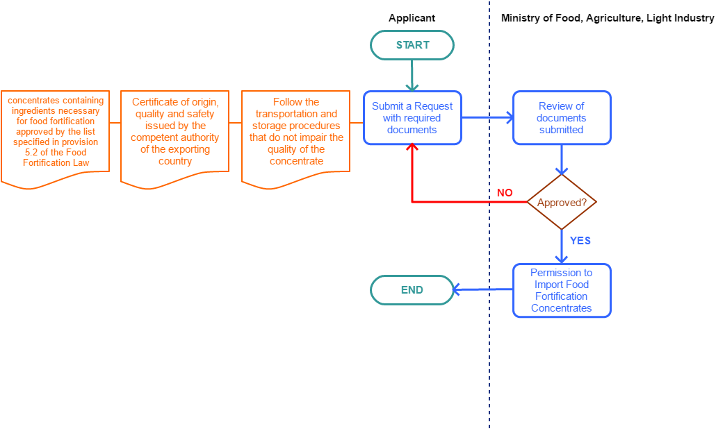 | Import Certificate for Fortified Food concentrates, 2018 | Certificate Requirement | | legal entities engaged in any business activities relating to Fortified Food concentration must fulfill the following requirements | To import concentrates containing ingredients necessary for food fortification approved by the list specified in provision 5.2 of The Food Fortification Law | The Food Fortification Law | 09-09-9999 | Good |